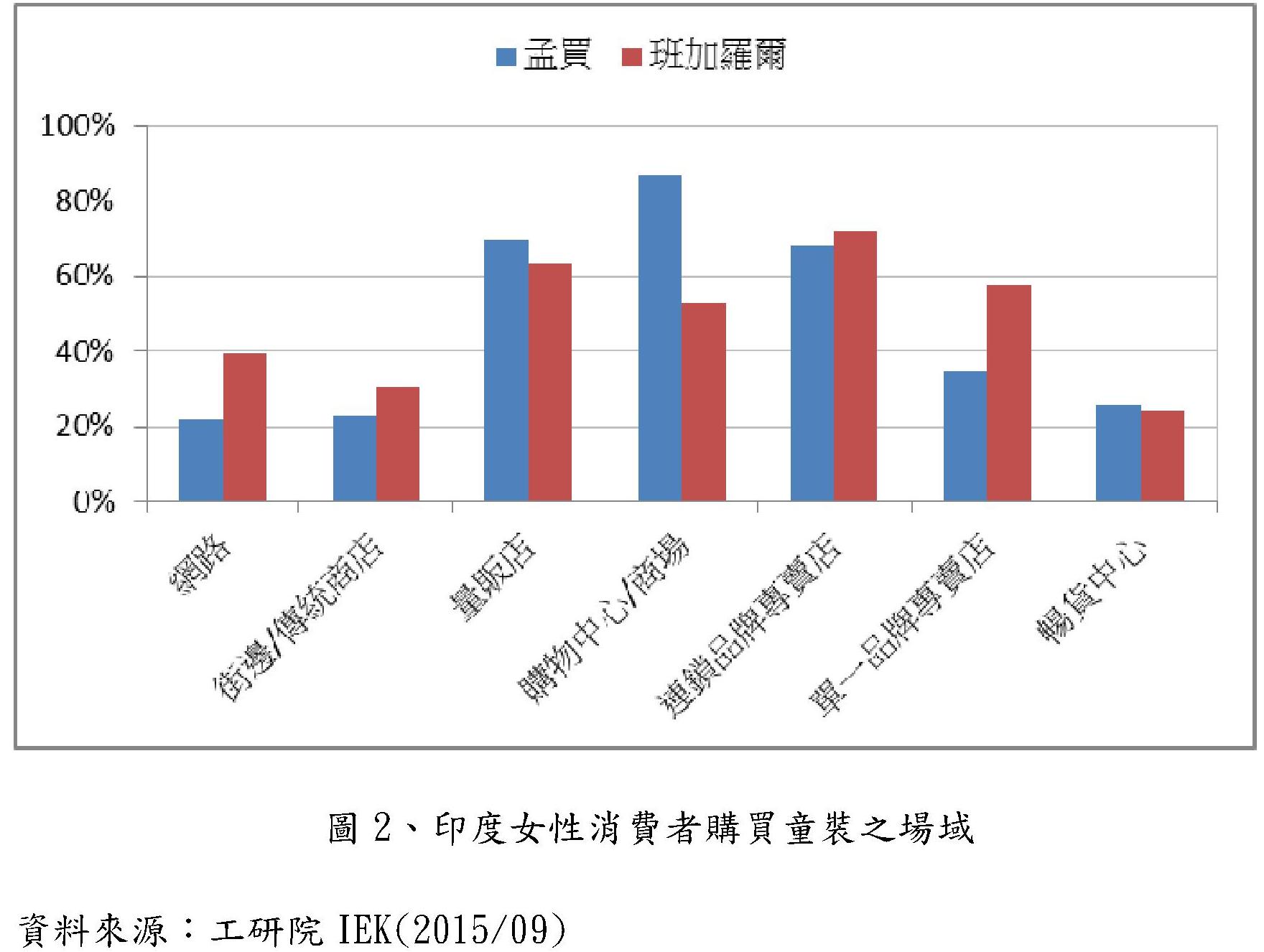 印度童裝(0-14歲)通路目前還是以實體通路為最主要的通路,但網路購買的情況也不容小覷,根據工研院IEK於2015年針對印度兩大城市孟買及班加羅爾曾購買過童裝之女性消費者所做的量化調查結果顯示,最常購買童裝的場域以實體通路為主,其中孟買女性消費者約有87%會在購物中心/商場購買,其次為量販店(70%)及連鎖品牌專賣店(68%),同時也有約22%的消費者會在網路上購買童裝。在班加羅爾,雖然同樣也是以實體通路為主,但網路購買的情況較孟買來的多,以調查結果來看,實體通路以連鎖品牌專賣店(72%)為最多,其次為量販店(64%)購買,同時在網路購買的消費者達整體的40%,網路購買童裝的比重較孟買來的高出許多。