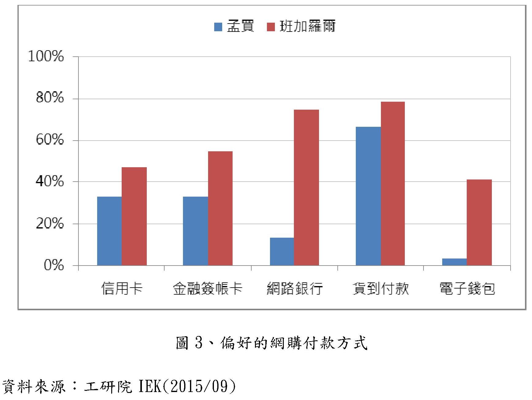 目前印度網站購物主要的付款方式約有五種,使用信用卡、金融簽帳卡、網路銀行、貨到付款及電子錢包。孟買的女性消費者傾向以貨到付款的方式付費,約占三分之一的比重,而在班加羅爾,貨到付款(78%)同樣是最喜愛的網購付款方式,但網路銀行的接受度也相當高,約占76%。