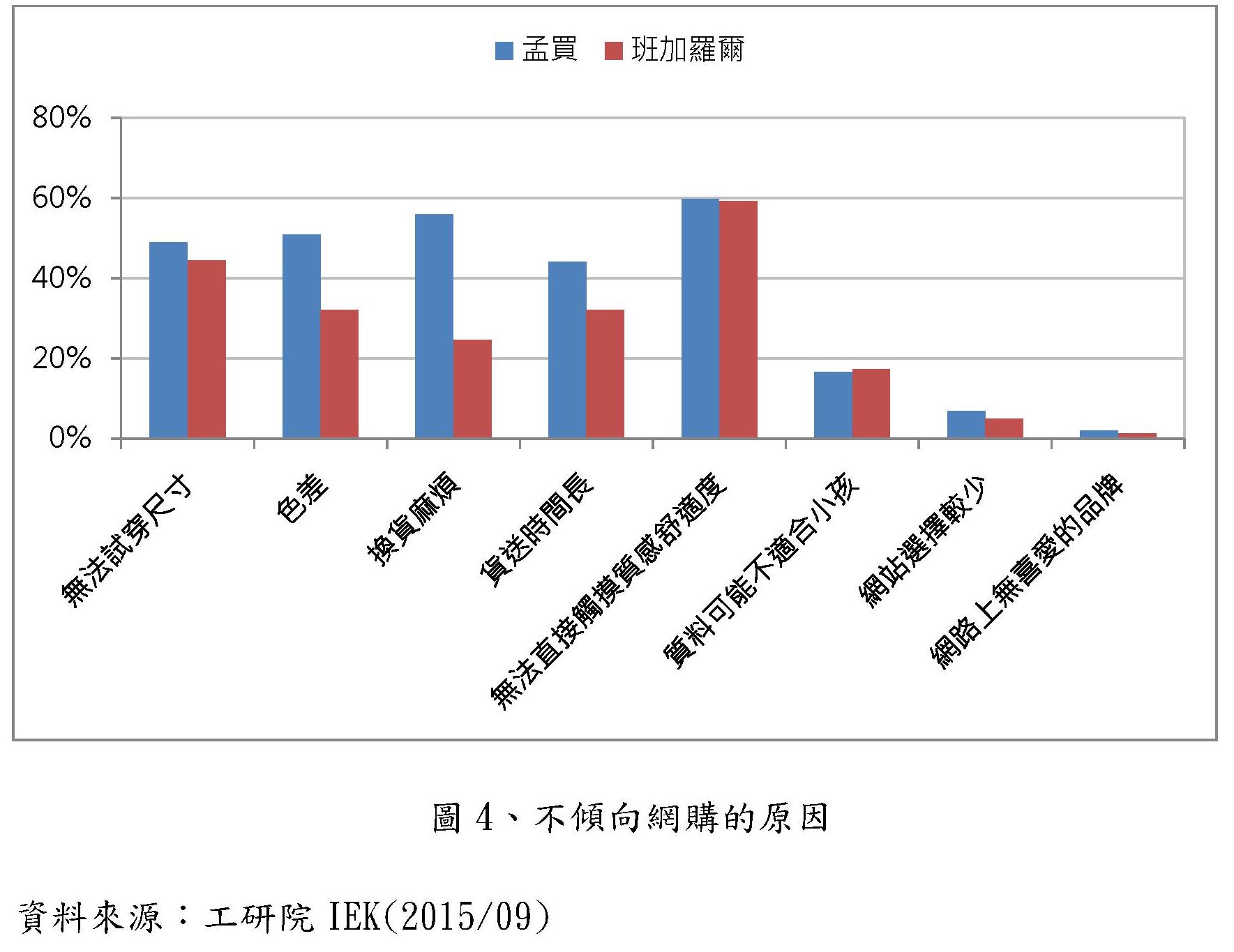 根據調查結果可以發現,通常不在網路購買童裝之女性消費者,主要乃因網購無法直接觸摸質感為最多人不選擇網購童裝時的原因。以城市別來看,孟買不在網路上購買的最主要原因為無法直接觸摸質感舒適度(60%),其次覺得退換貨很麻煩(56%)、可能有存在色差的問題(51%),而班加羅爾同樣也覺得無法直接觸摸質感舒適度(60%)是造成不想網購童裝的最主要原因,其次為尺寸可能不合(44%)的問題。