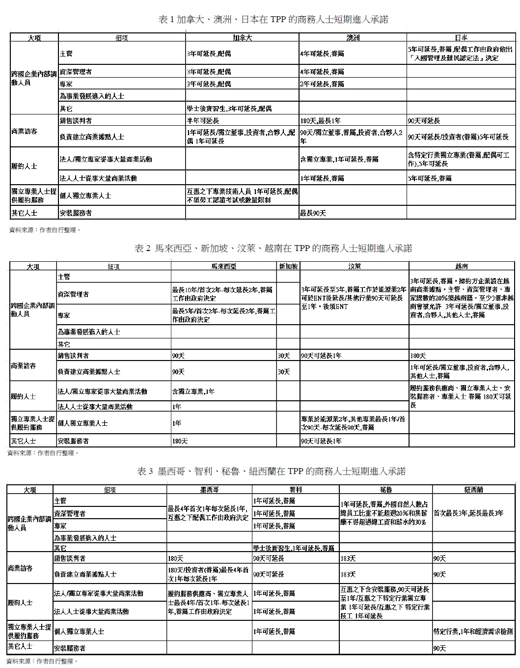 TPP目前12個成員中,只有美國尚未公布商務人士短期進入承諾表,其他11國的承諾表,加拿大、澳洲、日本承諾見表1,馬來西亞、新加坡、汶萊、越南承諾見表2,墨西哥、智利、秘魯、紐西蘭承諾見表3。