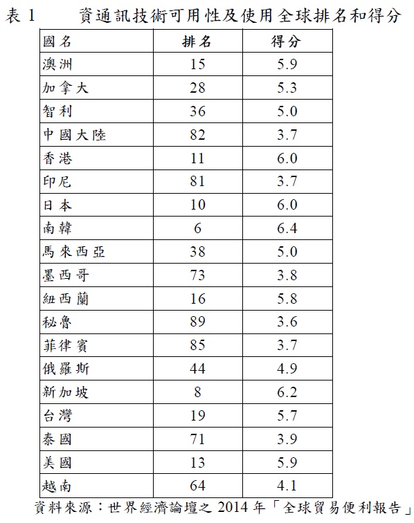 隨著世界各國重視網際網路的發展,從世界經濟論壇(WEF)發佈之2014年「全球貿易便利報告」(The Global Enabling Trade Index, GETI)中,我們可以發現從運輸與通訊基礎設施次指標角度來看,GETI第6支柱要素資通訊技術可用性及使用(Availability and use of ICTs)與網路發展程度有密切關聯。其衡量行動電話、網際網路、寬頻等工具在每個國家覆蓋率,並且衡量商業買賣企業運用網際網路對顧客之交流及政府線上服務指標。結果發現全球138個國家中,亞太經濟合作組織(APEC)部分成員的排名和得分(滿分為7分,最低為1分)如表1,歷年得分多數成員都有相當幅度的改進,顯示各國都在投資改善資通訊技術和設備。我國在APEC 19國中排名第8,在全球排名第19,僅次於南韓、新加坡、日本、香港、美國、澳洲、紐西蘭。
