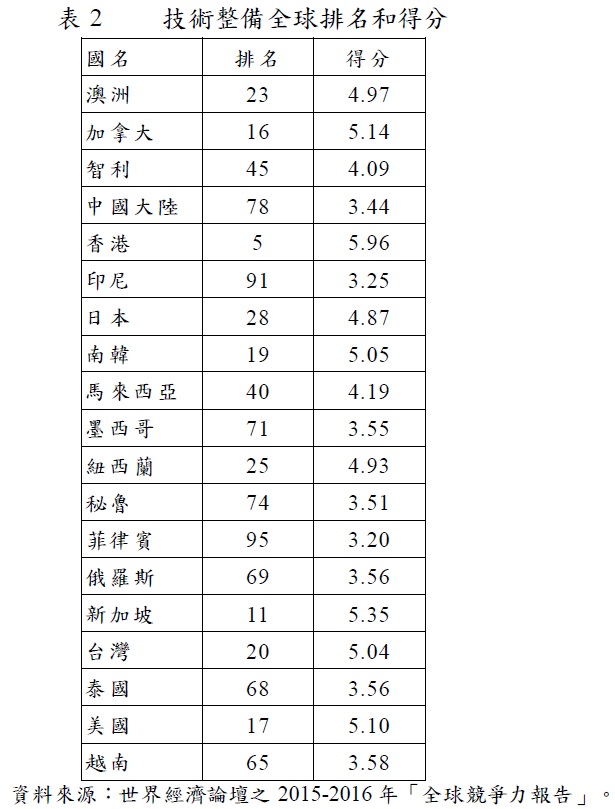 從世界經濟論壇(WEF)發佈之2015-2016年「全球競爭力報告」(The Global Competitiveness Report, GCR)第9支柱要素是技術整備(Technological readiness),衡量一經濟體採用現有技術來增強其產業生產力的靈活性。在當今全球化的世界中,技術已經越來越成為企業競爭和繁榮的一個重要因素。特別是資通訊技術(ICT)已經演變成為通用技術,其已經外溢到其他經濟部門,並且作為發揮高效率商業交易之基礎設施作用。因此,ICT介接和使用對於一經濟體的技術準備整體水平而言扮演重要組成成份。透過ICT連接,一國經營的企業能夠獲得先進的產品和藍圖,並利用它們的能力。而不是主要仰賴外人直接投資來取得國外技術的來源。結果發現全球144個國家中,亞太經濟合作組織(APEC)部分成員的排名和得分(滿分為7分,最低為1分)如表2,歷年得分多數成員都有相當幅度的改進,顯示各國都在投資吸收最新技術以利產業生產力提升。我國在APEC 19國中排名第6,在全球排名第20,僅次於香港、新加坡、加拿大、美國、南韓,日本、澳洲、紐西蘭和我國差距不大。