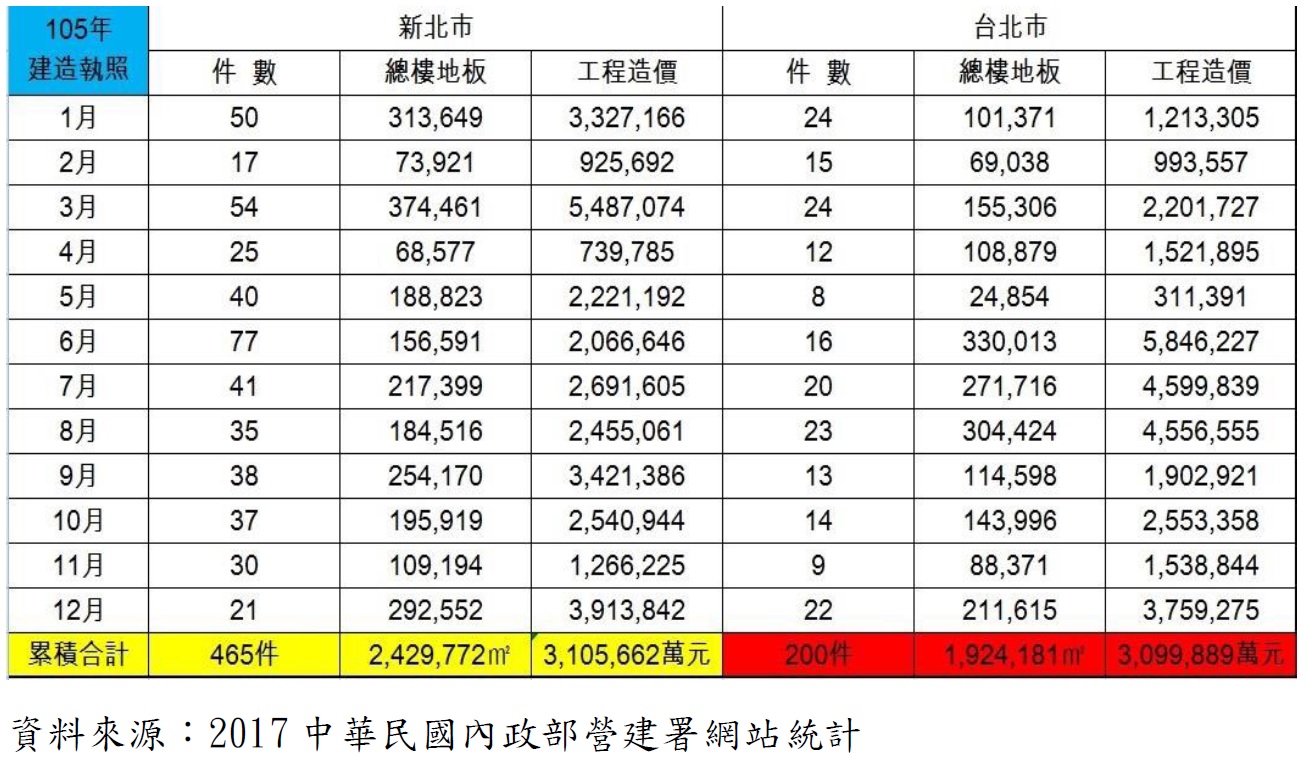 受了2016年雙北二市建造執照數量減少的影響,當建築開發商投資金額數量減少,開發案源減少,建築執照核發的數量降低時。則意味著營建產業將從建築開發案、建築師業務、營造廠工程、代銷公司接案、室內設計及裝修工程、建築材料提供等一系列產業,將於2017年後二年內相對萎縮低迷,相關產業仍有待後勢情況改變,而持續觀察。