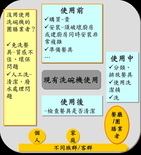 吉維那對於其潛在客群的使用洗碗機、甚至是洗碗的問題都有一定的瞭解(如圖1所示),在規劃出洗碗服務後,也會再進行巿場區隔,找出目標客群,再針對目標客群之特質,設計出具吸引力的服務內容與價格。