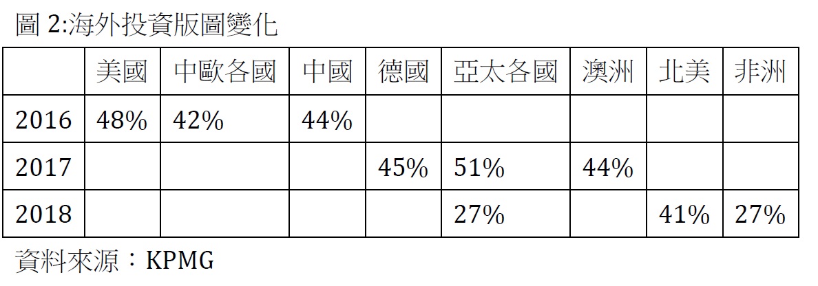 這種尋求企業務實成長表現在海外佈局上,也有較大的變動,吳美萍指出,隨著全球經濟市場變動迅速,台灣企業的投資計畫也因順應市場而不斷更新,2016年台灣CEO視美國、中國、中歐各國為主要投資市場,2017年則以亞太各國、德國與澳洲為國際投資市場,而今年CEO將北美視為第一優先拓展的目標,非洲與亞洲新興國家並到第二。