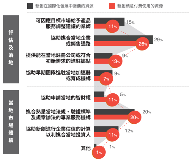 此外,延續去年對國際化的調查,今年深入了解新創面對國際化發展的資源需求,以及付費使用的意願,發現具國際化發展需求的新創企業,最大的資源需求來自於海外落地時「協助媒合當地企業或銷售通路」、「媒合熟悉當地法規、驗證標準及規章標準的專業服務機構」以及「可因應目標市場給予產品服務調整建議的業師」(圖1)。