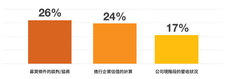 在募資準備期,新創遭遇的最大挑戰為何?調查結果顯示「募資條件談判/協商」與「企業估值的計算」是新創前兩大募資的挑戰 (圖2) 。
