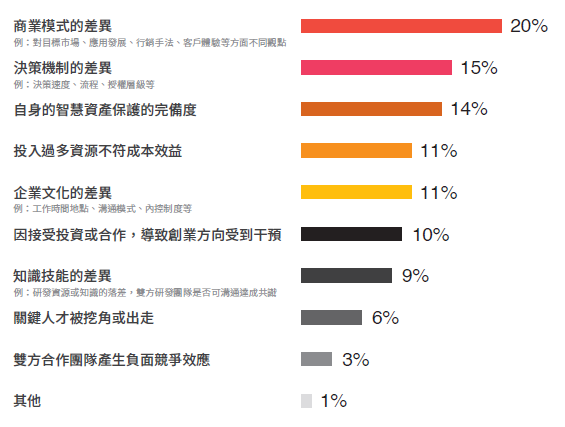 - 新創企業面對企業合作,前三大顧慮與挑戰依序為:商業模式的差異(20%)、決策機制的差異(15%)、自身智慧資產保護的完備度(14%)。